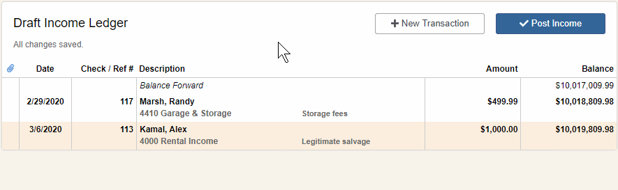 - As you add new transactions, you can view transaction details in the Draft Income Ledger below.