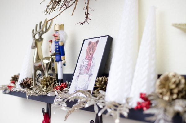 Now that your faux mantle is photo-ready, hang your favorite stockings on the hooks. I actually got ours from the dollar store! Simply adding felt wool pom pom balls can make even a dollar store stocking surprisingly trendy and fun. Congratulations, Santa will now know exactly where to put your peppermint sticks and little presents–no fireplace necessary.