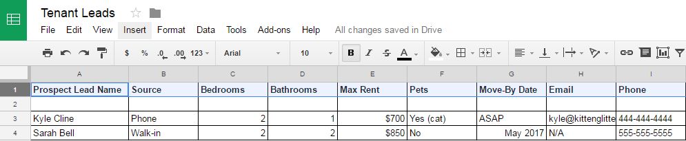 When a property becomes available, you can filter or sort your spreadsheet by number of bedrooms or by max rent or any other defining characteristic you choose to use.