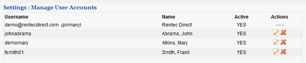 To access this new feature, click the Settings tab, and choose Manage User Accounts. The primary user (the one you signed up with and access Rentec with today) has access to manage and change any of the sub-user accounts including access to look up passwords.