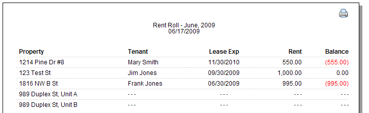 - Rent Roll – At a glance report of properties and tenants, their rent due, and current balance.