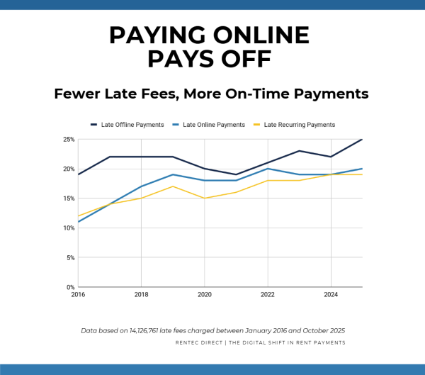 A new decade-long study reveals rapid adoption of online rent payments and major reductions in late fees for renters who pay digitally, according to a report from Rentec Direct property management software.