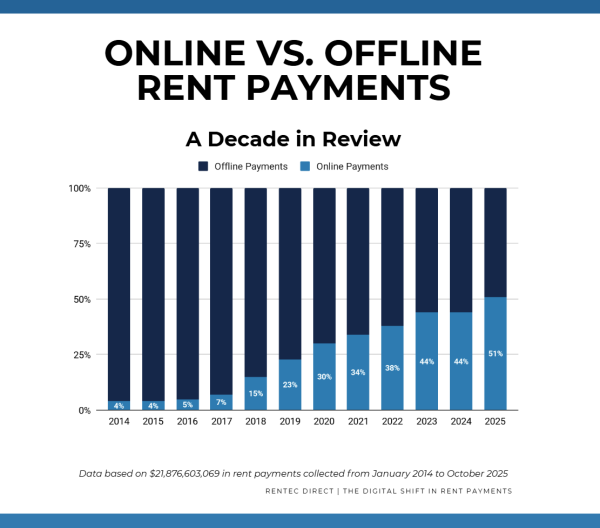 A new Rentec Direct analysis of more than 21.9 billion dollars in rent payments shows a historic milestone. For the first time, the majority of rent payments in the United States are made online. The ten-year study reveals that digital rent payments have surged from just 4 percent in 2014 to 51 percent in 2025.