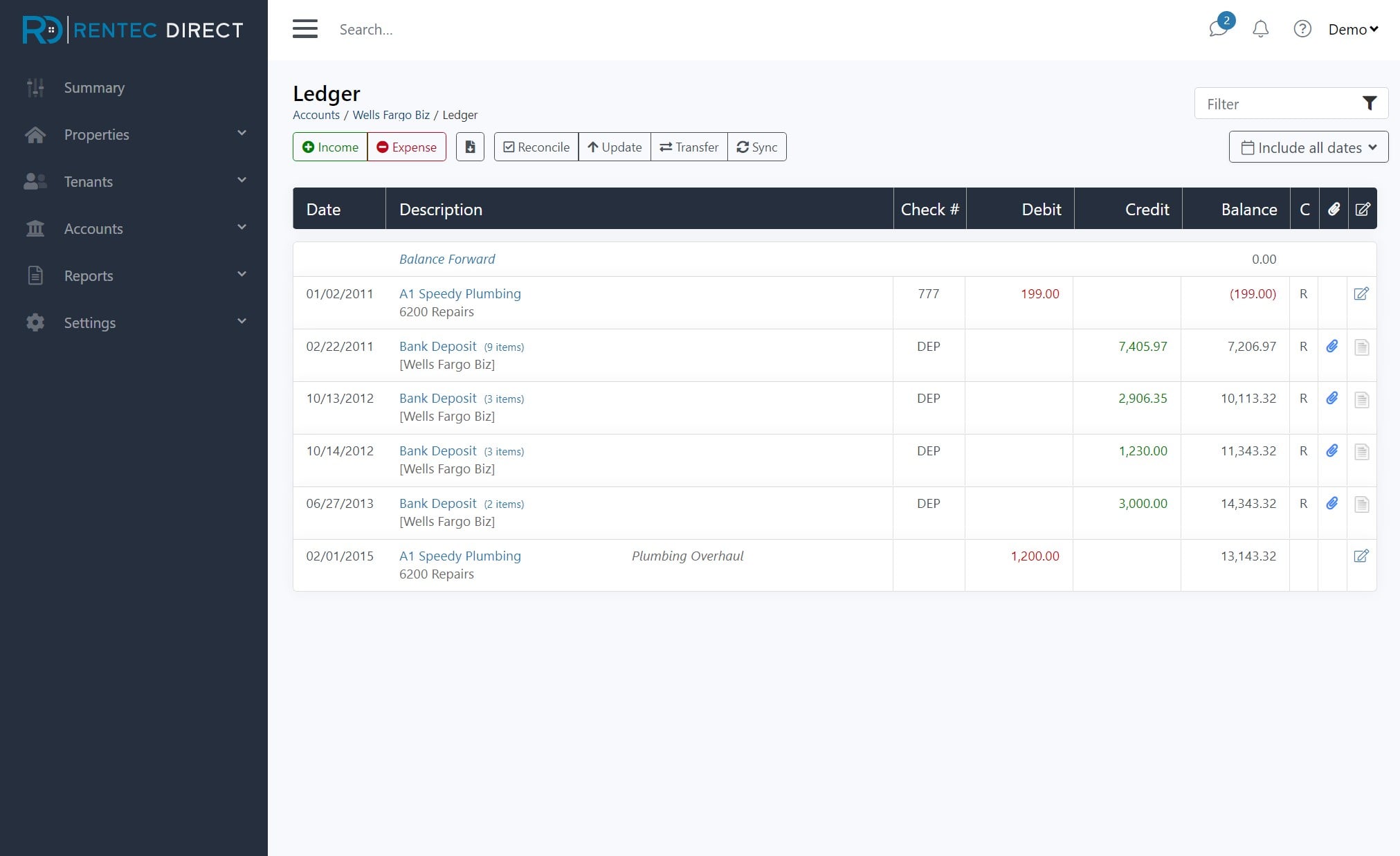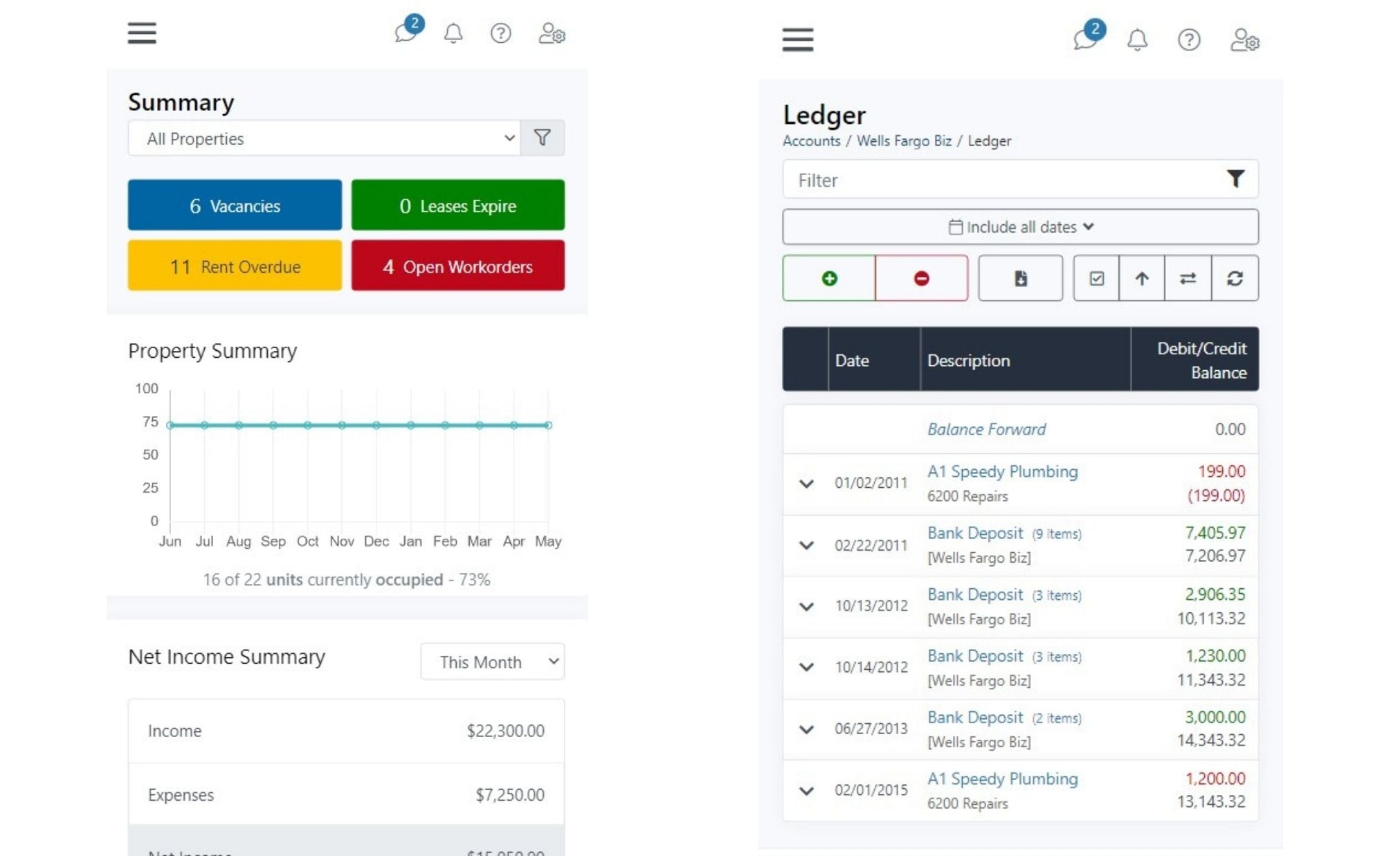 The software will now work perfectly on any mobile device. Every page in the system is designed for both desktop and mobile usage so no matter what device you work from, whether you are in the office or in the field, you will have full access to all data within Rentec Direct. The images below give a glimpse of what the Summary Page and your Ledger will look like on a mobile device.