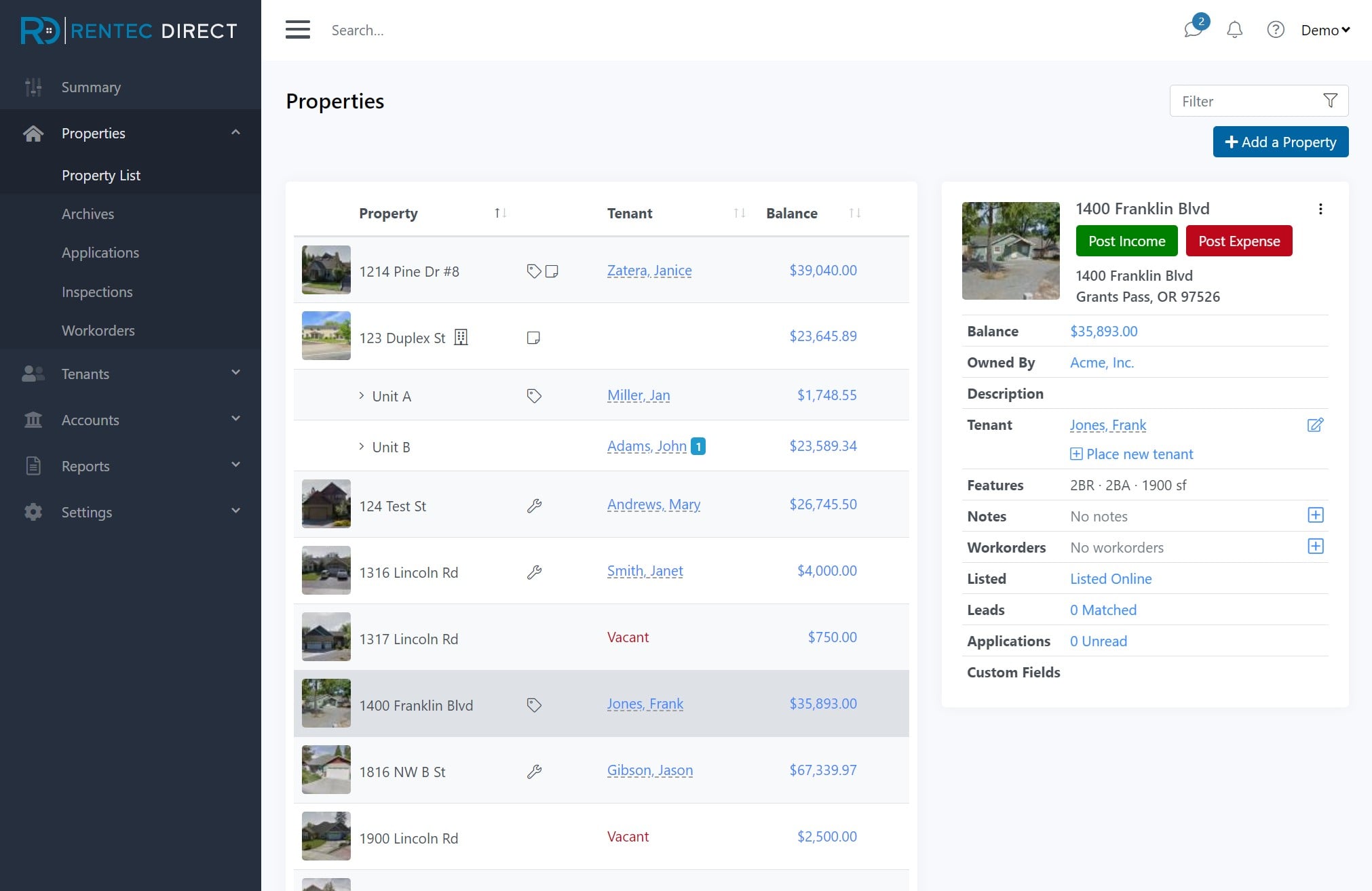 The Summary Page will have quick access links to get you directly to vacancies, expiring leases, overdue tenants, workorders, messages, and notices with a single click. Clicking any of these topics will automatically load just that subset of information.
